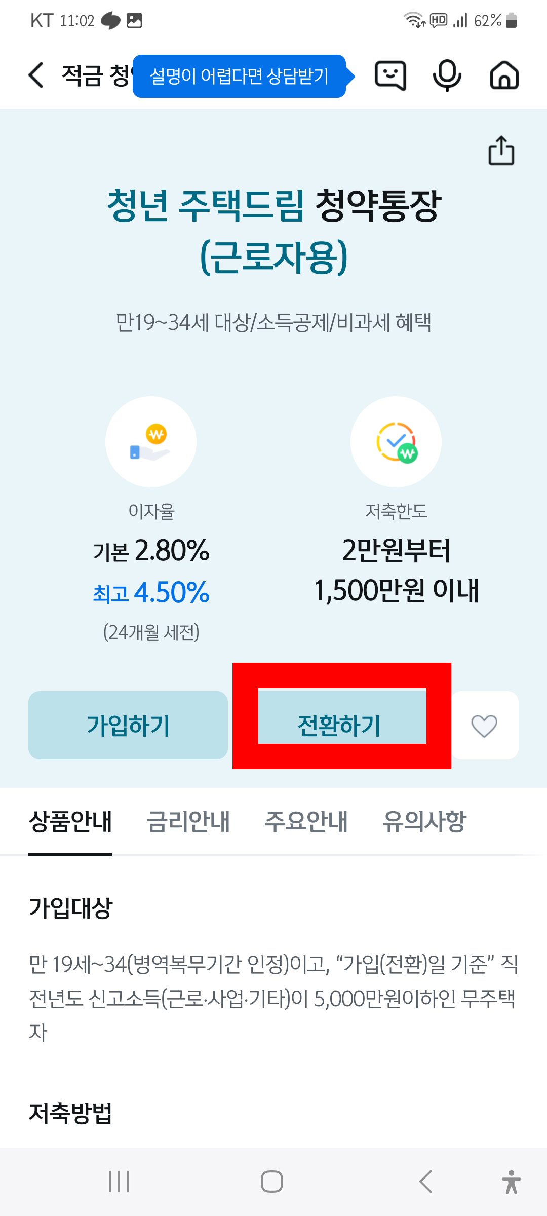 이미 있는 통장을 전환하는 것이니 전환하기. 새로 만드시는 분은 가입하기를 선택해주세요.